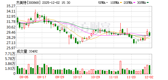 交易行情显示,12月2日,杰美特收跌3.07%,收于28.72元/股,总市值36.75亿元。