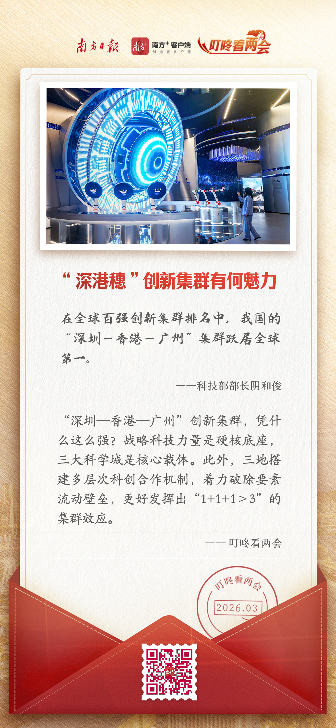 3月5日,在十四届全国人大四次会议首场“部长通道”集中采访活动中,科技部部长阴和俊点赞,“在全球百强创新集群排名中,我国的‘深圳—香港—广州’集群跃居全球第一”。