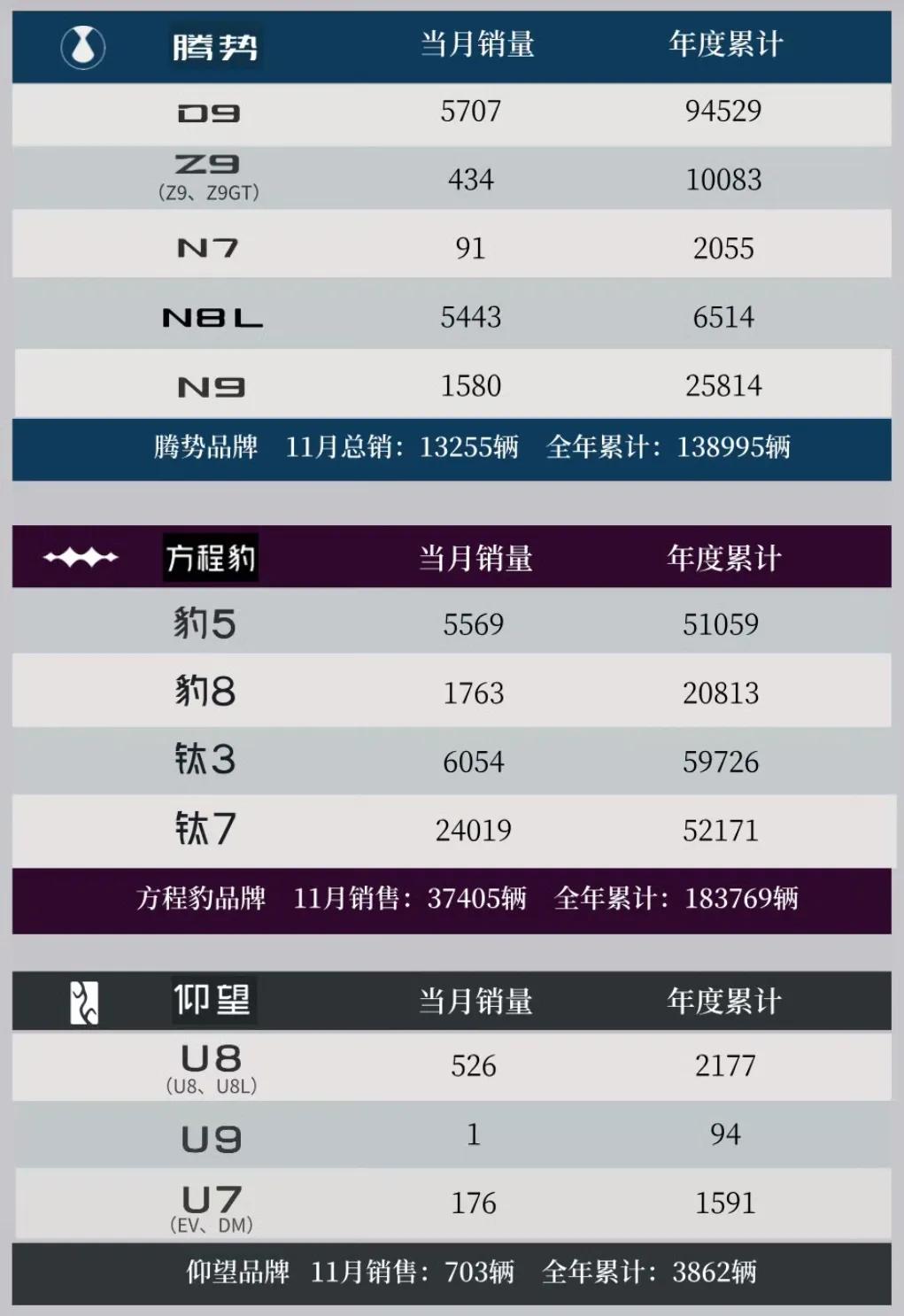 其它品牌方面,11月腾势品牌销量为1.33万辆,年内累计销量为13.90万辆。截至目前,腾势品牌在售车型包括腾势D9、腾势N8L、腾势N9、腾势Z9、腾势N7共计5款车型,11月销量分别为5707辆、5443辆、1580辆、434辆和91辆。其中,腾势N8L是腾势汽车旗下大型SUV车型,于今年10月上市,彼时售价为29.98-32.98万元。作为腾势品牌“旗舰双子星”矩阵的重要一员,腾势N8L与腾势N9一脉相承,覆盖差异化细分市场,全系标配易三方安全技术、2.0T超级混动系统、天神之眼B-辅助驾驶激光版(DiPilot 300)以及云辇-A智能车身控制系统等。