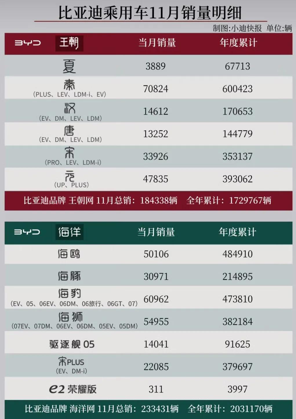 作为国内最大的新能源汽车厂商,比亚迪在新能源市场已布局比亚迪、腾势、方程豹、仰望共四大品牌。其中,比亚迪品牌拥有王朝网和海洋网两大销售网络,这两大销售网络也是比亚迪最重要的销量来源。据相关数据显示,11月王朝网和海洋网销量为42.36万辆。其中,王朝网11月销量为18.43万辆,年内累计销量为172.98万辆。细分车型中,11月秦、元、宋、汉、唐、夏车型销量分别为7.08万辆、4.78万辆、3.39万辆、1.46万辆、1.33万辆、0.39万辆。而海洋网11月销量为23.34万辆,年内累计销量为203.12万辆。细分车型中,11月海豹、海狮、海鸥、海豚、宋PLUS、驱逐舰05、e2荣耀版车型销量分别为6.10万辆、5.50万辆、5.01万辆、3.10万辆、2.21万辆、1.40万辆、311辆。