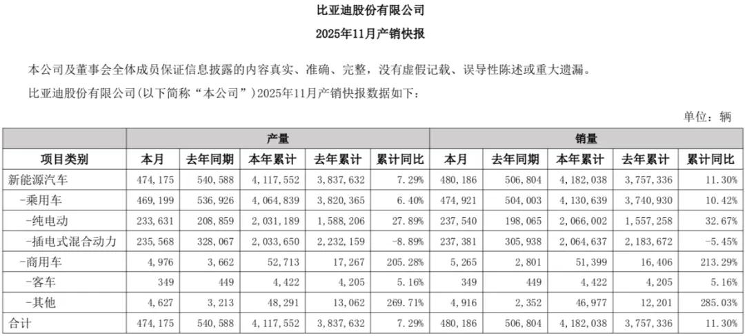 12月1日,比亚迪发布2025年11月以及2025年1-11月销量数据。数据显示,2025年11月,比亚迪新能源汽车销量为48.02万辆,其中纯电动车销量为23.75万辆;插电混动车销量为23.74万辆。此外,11月比亚迪出口新能源汽车为13.19万辆。截至11月底,比亚迪新能源汽车累计销量为418.20万辆,同比增长11.30%,其中纯电动车销量为206.60万辆;插电混动车销量为206.46万辆。